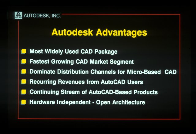 In the final days before Autodesk's initial public stock offering (IPO) in May of 1985, John Walker and Al Green went on the traditional “road show” (or “dog and pony show”—I don't know who was the dog and who was the pony, but I sure felt like a dog by the time it was over!). This involves travelling to various cities in the United States to meet with the institutional investors to whom the investment bankers are trying to peddle the offering. As I recall, we made road show presentations in San Francisco (a warm-up for the trip), Los Angeles, Minneapolis, Chicago, Boston, New York, and Baltimore (the latter the home city of one of our underwriters, Alex. Brown).