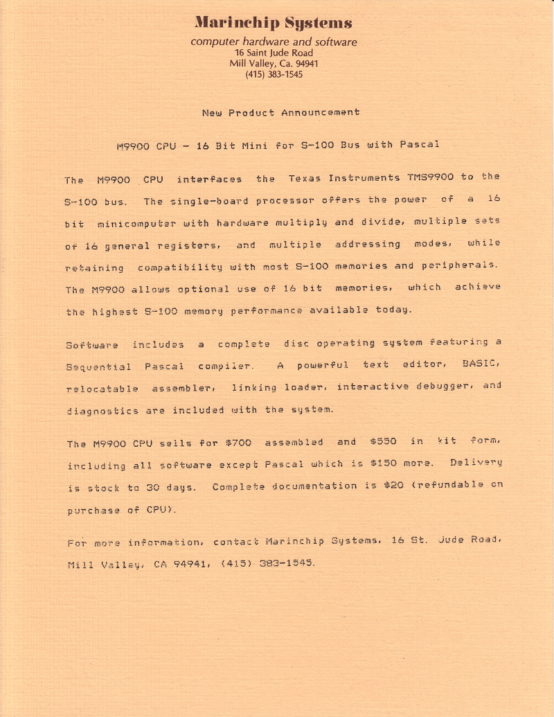 When the M9900 CPU was available for sale, we mailed this new product announcement to all of the industry (both personal computing and general electronics) magazines, many of which ran it in some form in their new product sections. The press release was accompanied by an eight by ten inch glossy print of the photograph of the circuit board which was taken for and appeared in our first advertisement.