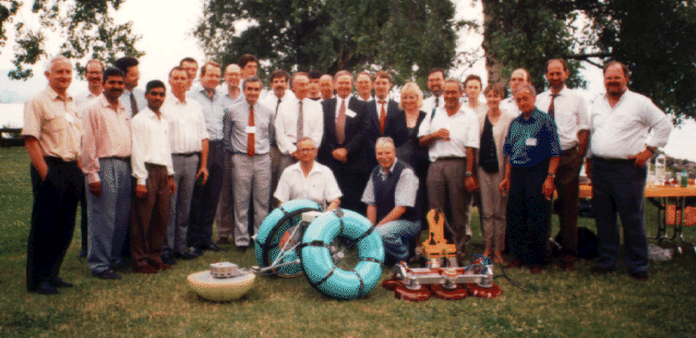 Photo of attendees (human and robotic) of the Workshop on Anti-personnel Mines Detection and Removal (WAPM-95), held June 30th and July 1st 1995 in Lausanne, Switzerland.
