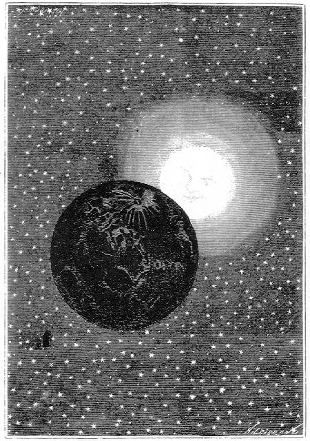 « Nous ne nous plaindrons pas, fit observer Michel Ardan, de la monotonie de notre voyage ! Quelle diversité, au moins dans la température ! Tantôt nous sommes aveuglés de lumière et saturés de chaleur, comme les Indiens des Pampas ! tantôt nous sommes plongés dans de profondes ténèbres, au milieu d'un froid boréal, comme les Esquimaux du pôle ! Non vraiment ! nous n'avons pas le droit de nous plaindre, et la nature fait bien les choses en notre honneur.