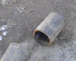 a replacement pipe, also steel, with a sliding sleeve joint which fit over the ends left when the failed section was cut out. The sleeve has joints with what appear to be brass compression gaskets, which are forced into a seal by extensive pounding on a