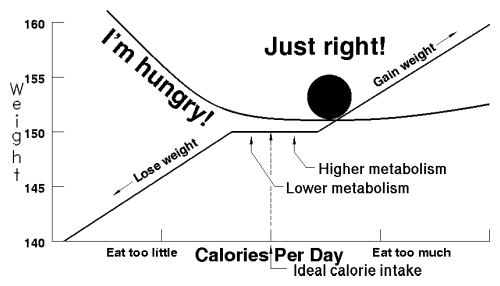 There are many ways in which an individual's appetite feedback curve can be related to calorie requirements but, as noted by the engineering aphorism, only three possible outcomes. Weight can blow up (gain constantly, like Buster), oscillate (Oscar's lose/gain rollercoaster, so familiar to many of us), or stay about the same (lucky Sam). If you flip the feedback curves in these charts left for right, you have depictions of an anorexic, an individual who tends to lose weight, and Sam. A multitude of reasons: organic, cultural, and psychological, may explain why feedback fails in certain people. Many diet books counsel searching yourself for the underlying causes of weight gain and remedying them. This may be an interesting and rewarding process, but it's no way to lose weight. It's kinda like becoming an expert watchmaker to fix your Timex that keeps stopping and nobody can seem to repair. The wiser man buys a new watch.