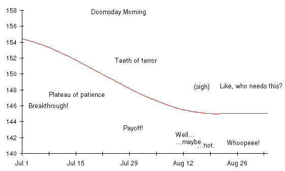 Shortly after Dexter began his diet, he started to lose weight. He continued to lose until he declared the diet successful in the third week of August, after which his weight leveled off at the goal of 145 pounds. Imagine how calm and confident Dexter's diary would have been if he'd plotted this curve instead of daily weight.