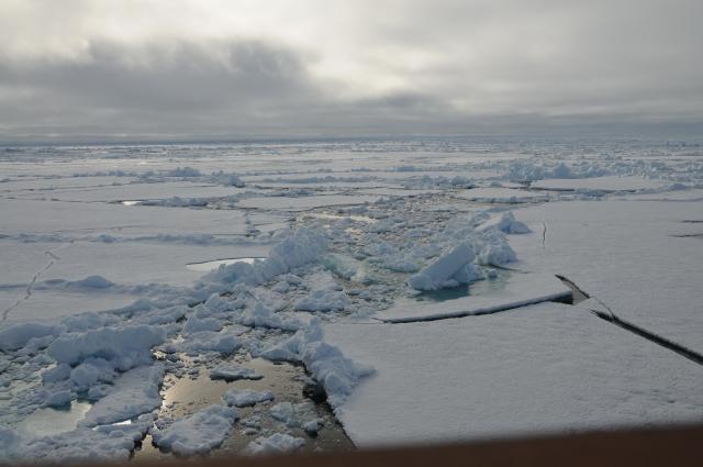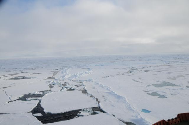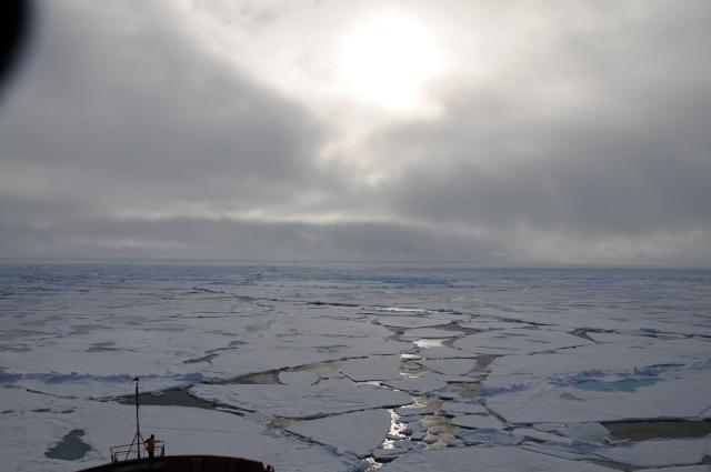 The following twenty-five minute video (broadband connection required: 1489–3481 kBit/sec transfer rate, total file size 264–617 Mb, depending on format) shows breaking ice from several different perspectives as we proceeded southward through the pack ice from the Pole. Our course paralleled the path broken heading north, but due to the dynamics of icebreaker operation, for the most part we broke ice adjacent to the northward path, pushing the broken ice into the channel from our earlier passage. There's something about this video that's strangely evocative of the “looking out the window” television transmissions from Apollo missions orbiting the Moon.