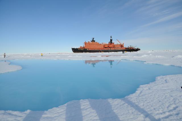 There were a number of shallow melt ponds in the ice around the ship. These are common in the arctic summer. The water in the ponds is fresh. There is between one and two metres of ice between the bottom of the pond and the sea.