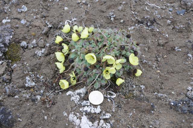 There were fewer wildflowers here than on the comparatively lush Ziegler Island, but there were still abundant Arctic poppies. A one Euro coin provides a sense of scale.