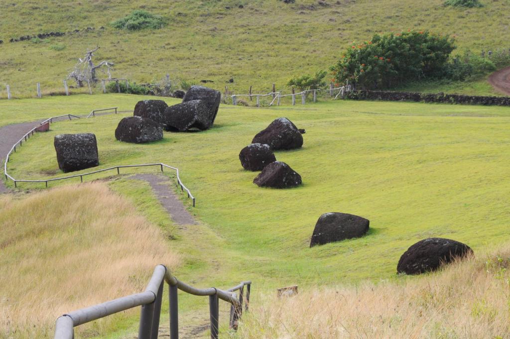 The topknots or hats placed on some of the moai statues, pukao, are made of a red volcanic stone called scoria. All of them were quarried from this volcanic cinder cone near Hanga Roa. Here are some of the topknots in various states of completion which remain near the quarry where they were found in modern times.