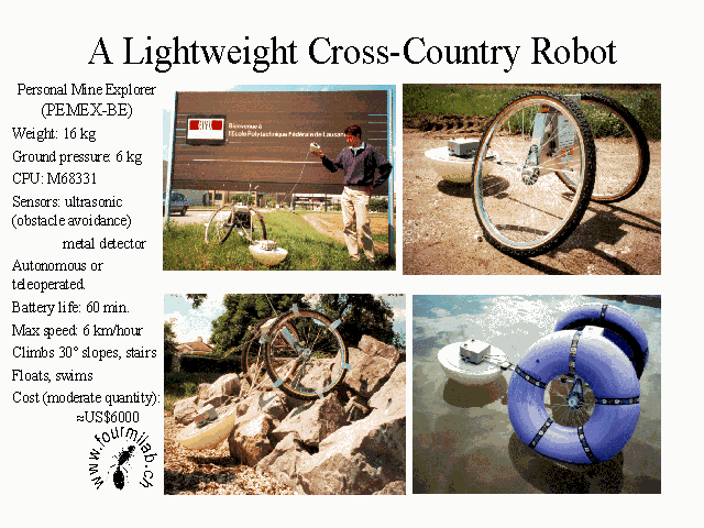 To explore the light-weight, low-cost end of the robot spectrum, the demining project in Lausanne built a series of miniature prototypes and finally a full sized prototype of the Personal Mine Explorer robot. It weighs a total of 16 kilograms and never exerts a force of more than 6 kg on the ground. A lighter production model should be able to exert sufficiently little pressure to avoid triggering any non-defective antipersonnel mine. The robot moves both wheels together to advance and differentially to sweep the sensors in the white dome back and forth over the terrain.